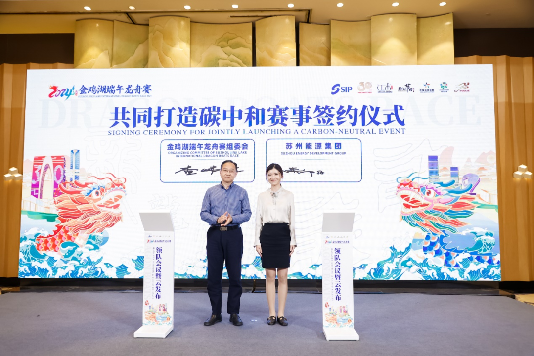 2024年5月23日,蘇州能源集團(tuán)與金雞湖龍舟賽組委會(huì)就共同打造碳中和賽事進(jìn)行簽約,全力將金雞湖端午龍舟賽打造成為蘇州首場(chǎng)碳中和龍舟賽。